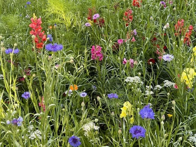 Colorful spring flowers in grass and sunlight. Photo by Dawn Vogel